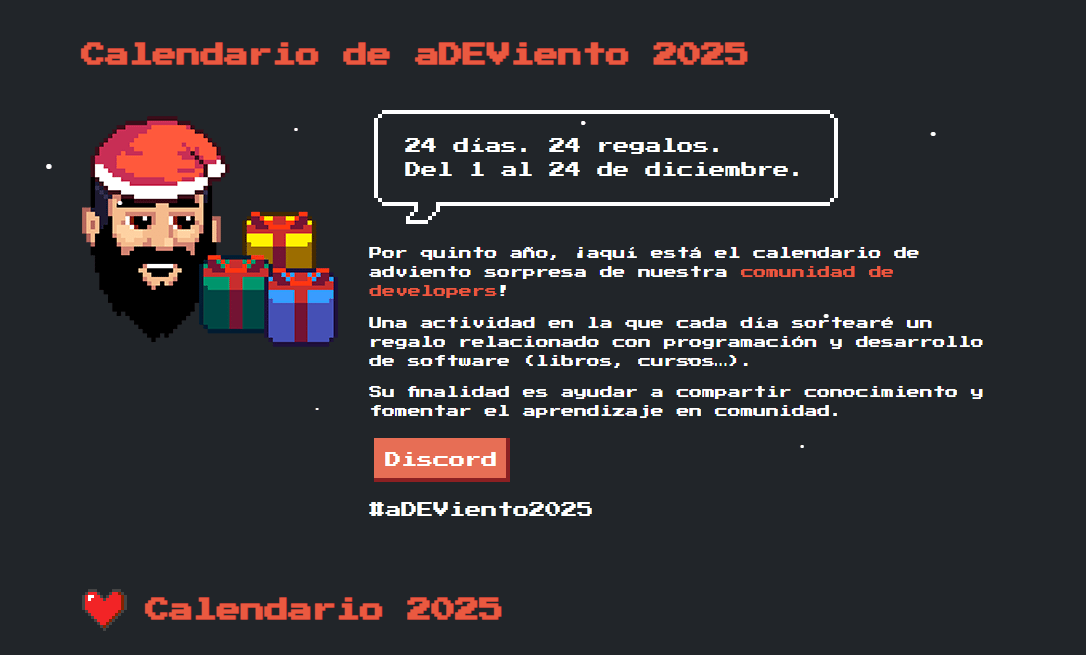 Brais ha vuelto a liarla con Adviento.dev, el calendario de adviento donde cada día del 1 al 24 de diciembre te cae un recurso, herramienta, curso o sorpresa pensada para devs.