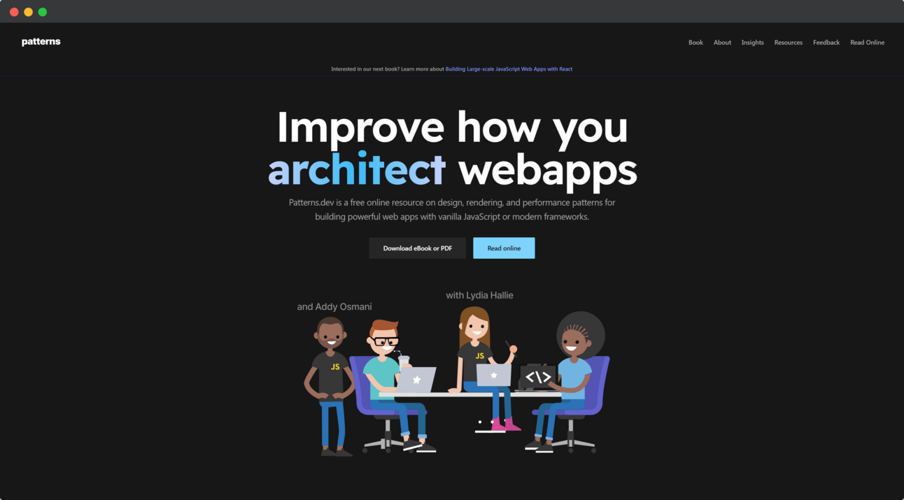 Patterns.dev ofrece un catálogo gratuito de patrones de diseño, consejos y trucos para mejorar la arquitectura de aplicaciones web.