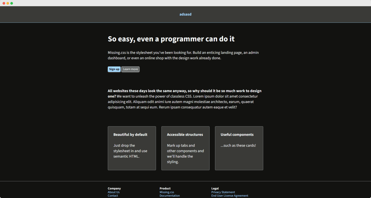 Missing.css te proprociona unos estilos predeterminados de CSS para tu página web. Ofrece: